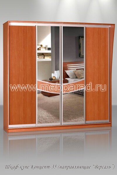 Шкаф-купе "Концепт - 35" имеет раздвижные двери и особенно понравится любителям стиля хай-тек. Подобрав наиболее удачное сочетание цвета и фактуры материалов, Вы получите идеальный шкаф для Вашей комнаты или прихожей. Модель удобна и вместительна, изготовлена из экологически чистых качественных материалов. Красивый по дизайну, наличие зеркал поможет визуально увеличить пространство. Направляющие "Versal" (золото, серебро, бронза, шампань), при изготовлении с направляющими в цвет шкафа необходимо прибавить + 1500 руб. Производится с использованием комплектующих из анодированного алюминиевого профиля. Усовершенствованная конструкция роликов и направляющих обеспечивает бесшумный и плавный ход дверей.