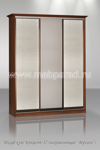 Шкаф-купе "Концепт - 32" имеет раздвижные двери и особенно понравится любителям стиля хай-тек. Подобрав наиболее удачное сочетание цвета и фактуры материалов, Вы получите идеальный шкаф для Вашей комнаты или прихожей. Модель удобна и вместительна, изготовлена из экологически чистых качественных материалов. Направляющие "Versal" (золото, серебро, бронза, шампань), при изготовлении с направляющими в цвет шкафа необходимо прибавить + 1500 руб. Производится с использованием комплектующих из анодированного алюминиевого профиля. Усовершенствованная конструкция роликов и направляющих обеспечивает бесшумный и плавный ход дверей.