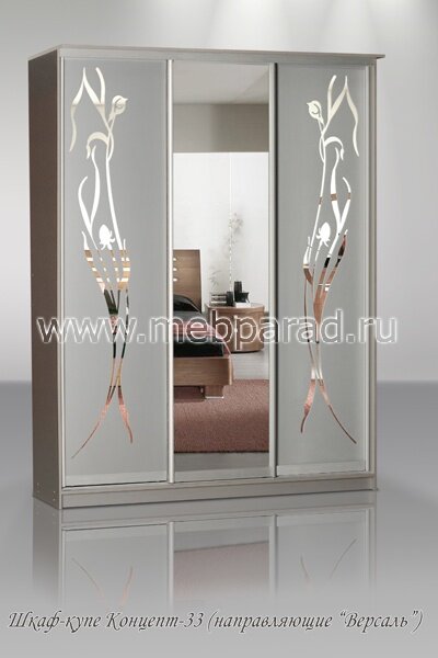 Шкаф-купе "Концепт - 33" имеет раздвижные двери и особенно понравится любителям стиля хай-тек. Подобрав наиболее удачное сочетание цвета и фактуры материалов, Вы получите идеальный шкаф для Вашей комнаты или прихожей. Модель удобна и вместительна, изготовлена из экологически чистых качественных материалов. Направляющие "Versal" (золото, серебро, бронза, шампань), при изготовлении с направляющими в цвет шкафа необходимо прибавить + 1500 руб. Производится с использованием комплектующих из анодированного алюминиевого профиля. Усовершенствованная конструкция роликов и направляющих обеспечивает бесшумный и плавный ход дверей.