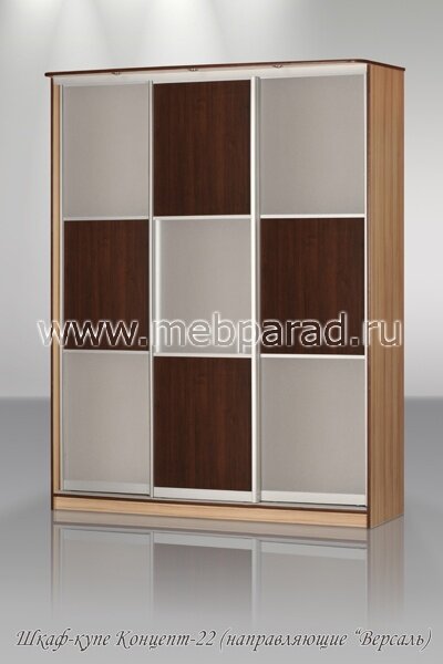 Шкаф-купе "Концепт - 22" имеет раздвижные двери и особенно понравится любителям стиля хай-тек. Подобрав наиболее удачное сочетание цвета и фактуры материалов, Вы получите идеальный шкаф для Вашей комнаты или прихожей. Модель удобна и вместительна, изготовлена из экологически чистых качественных материалов. Направляющие "Versal" (золото, серебро, бронза, шампань), при изготовлении с направляющими в цвет шкафа необходимо прибавить + 1500 руб. Производится с использованием комплектующих из анодированного алюминиевого профиля. Усовершенствованная конструкция роликов и направляющих обеспечивает бесшумный и плавный ход дверей.