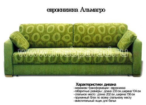 Ящик для белья и подушки. Механизм трансформации: Еврокнижка. Наполнение спального места: ортопедический пружинный блок по всему спальному месту. Вид покрытия: Несъемные чехлы Габариты: 104х233, спальное место:156х202